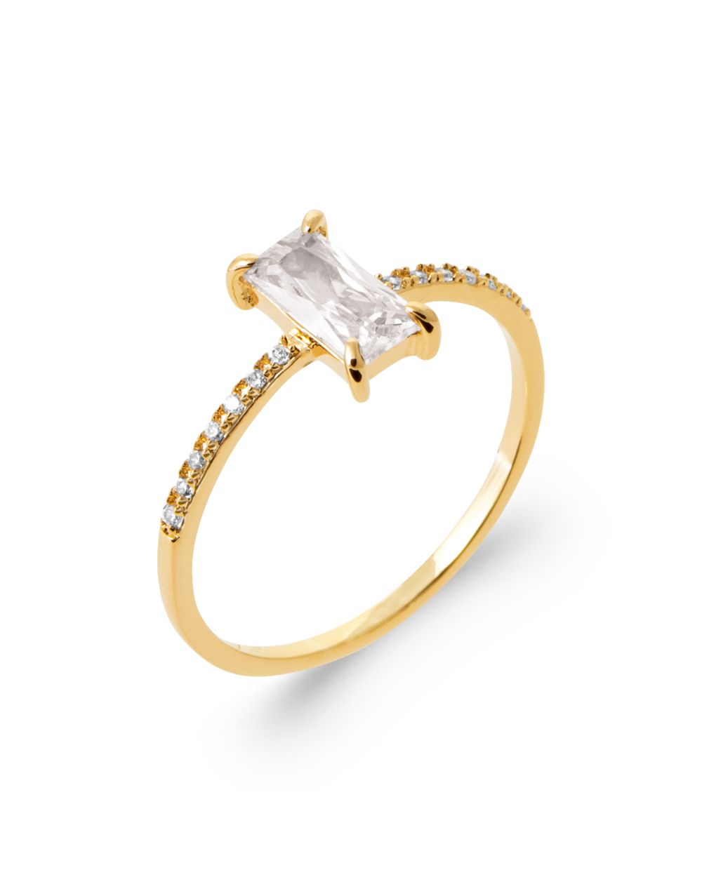 Deze hoogwaardige 18-karaats vergulde ring is een fijne solitaire-set met een rechthoekige steen van 8 mm lang en 4 mm breed. Het lichaam van de ring (2 mm groot) is eveneens bezet met zirkoniumoxide steentjes.