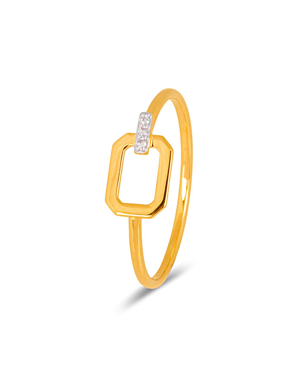 Deze 9 karaat geelgouden ring is een ring gevormd door een rechthoek, waarvan een deel is bezet met 0,02 karaat GH-P2 diamanten. De rechthoek is 8 mm lang en 6 mm breed.