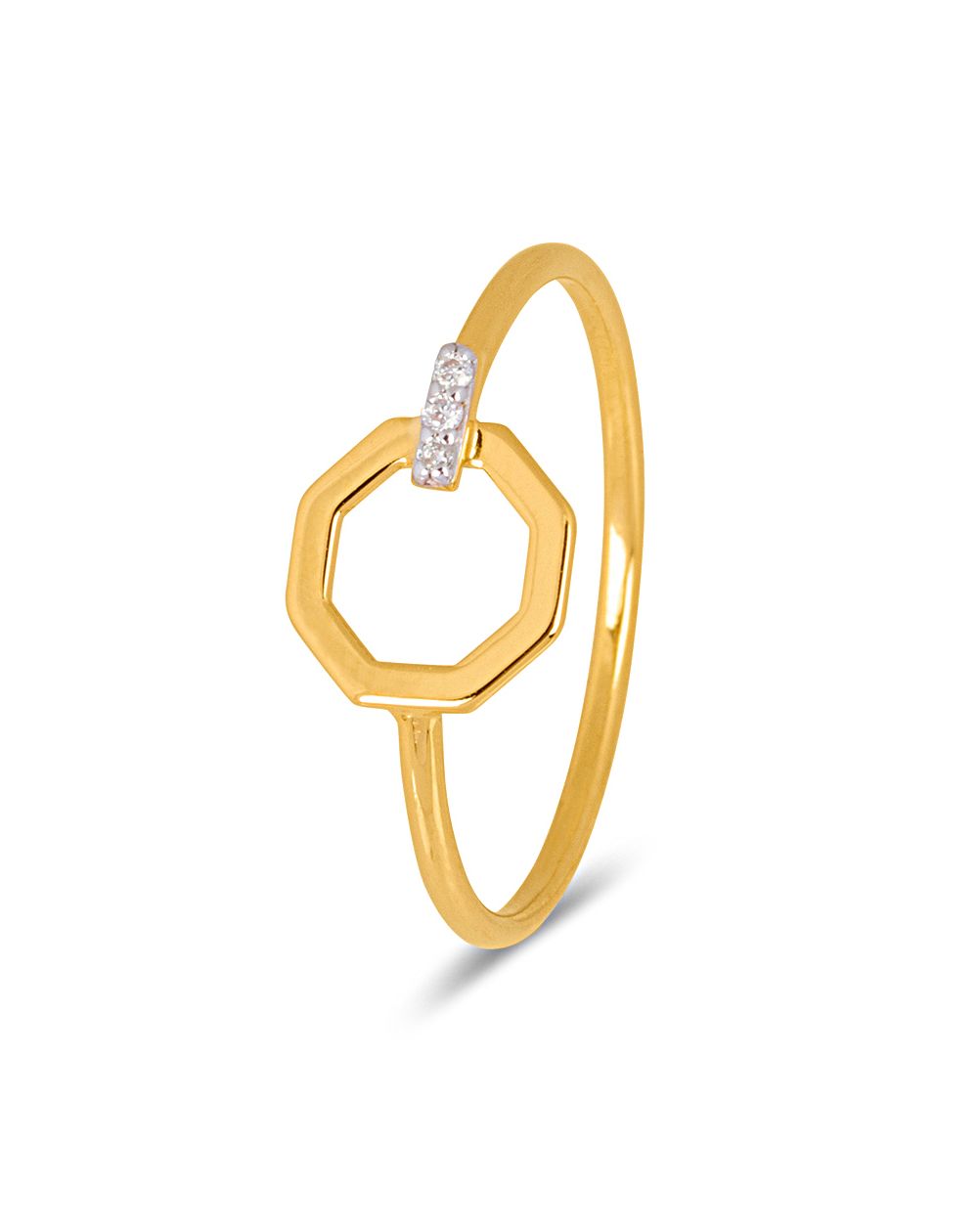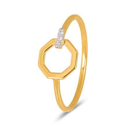 Deze 9-karaats geelgouden ring is een ring gevormd door een zeshoek, waarvan een deel bezaaid is met diamanten. De zeshoek heeft een diameter van 8 mm.