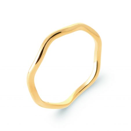 Deze vergulde ring kenmerkt zich door zijn minimalistische en moderne vormgeving. Het heeft een onregelmatige geometrische vorm, vergelijkbaar met een zachte golf of een abstract silhouet, waardoor het een uniek en vloeiend uiterlijk krijgt. Het gladde, glanzende oppervlak reflecteert het licht op een aantrekkelijke manier, waardoor dit meubelstuk met gemak stijlvol is. Perfect voor een eigentijdse look. Je kunt hem alleen dragen voor een verfijnde stijl of combineren met andere ringen voor een stoerder effect.