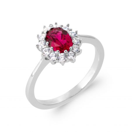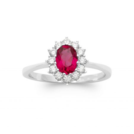 Deze zilveren ring is voorzien van een ovale rode zirkonia, omringd door een halo van kleine, fonkelende steentjes. Het elegante en klassieke ontwerp benadrukt de schoonheid en schittering van de stenen.