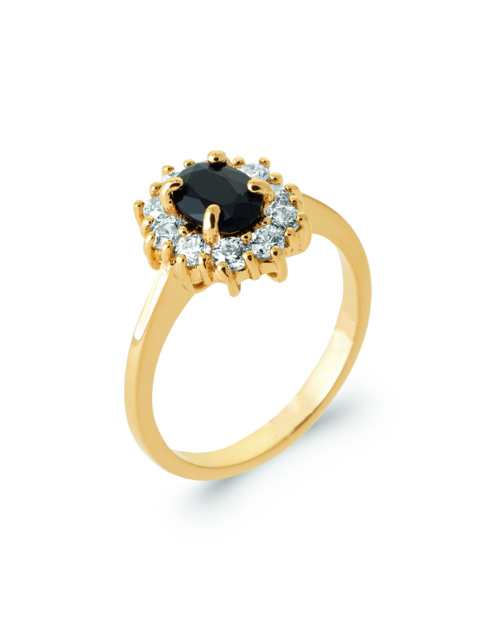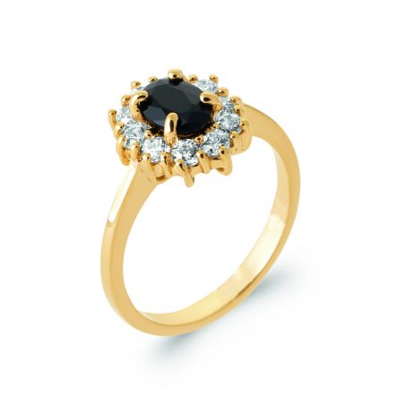 Deze elegante ring is verguld en versierd met een prachtige centrale zwarte zirkonia, omringd door sprankelende witte zirkonia. Het verfijnde ontwerp benadrukt de glans van de stenen en de finesse van de goudlaag, wat een chique en verfijnde uitstraling biedt. Deze ring is perfect voor elke gelegenheid en voegt een vleugje glamour en verfijning toe aan elke outfit.