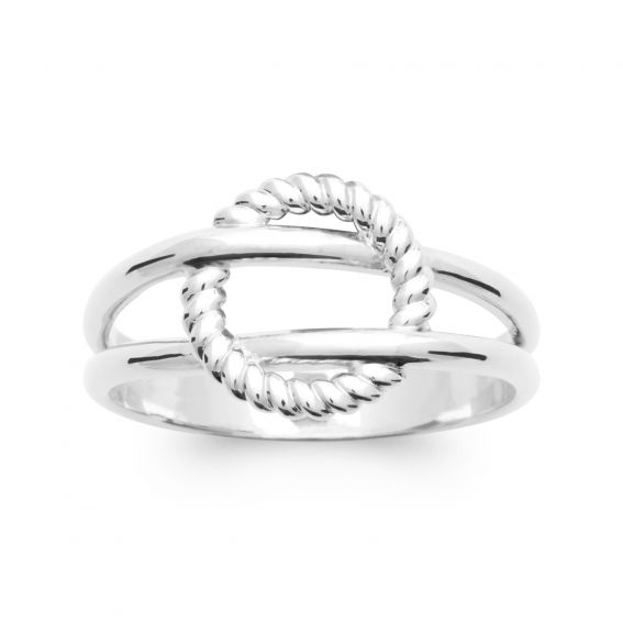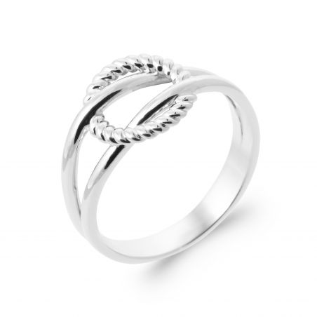 Ontdek deze prachtige damesring van gerhodineerd 925 zilver, perfect om een vleugje verfijning aan je stijl toe te voegen. Dit sieraad valt op door zijn met elkaar verweven ontwerp, waarbij twee banden harmonieus samenkomen in het midden.