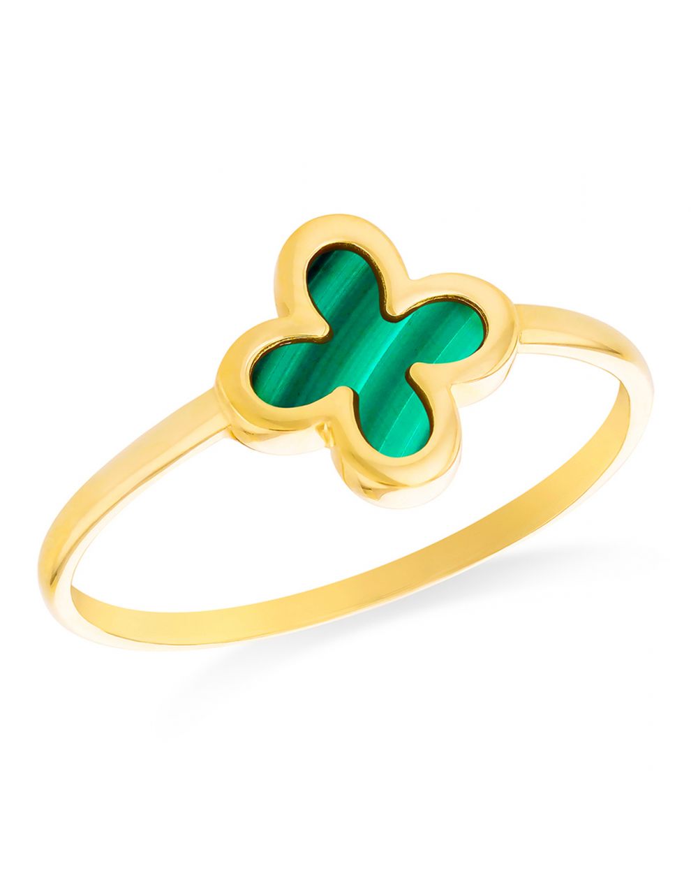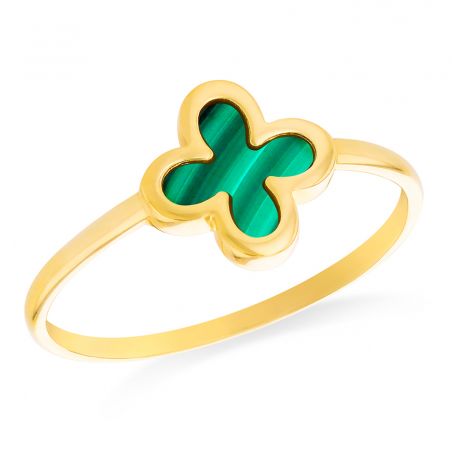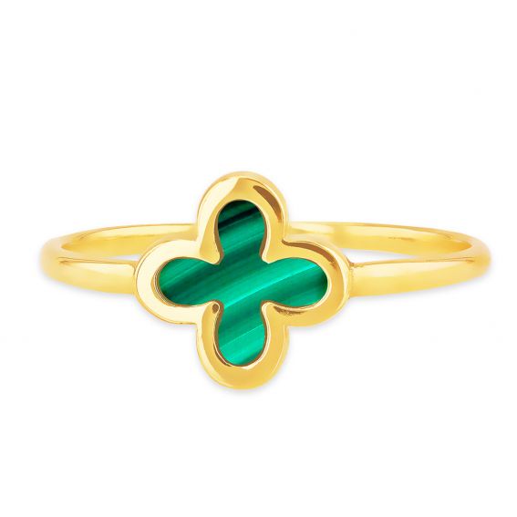 Deze malachiet klaverring is gemaakt van 9 karaat geelgoud en heeft een klaver van 8,6 mm, bedekt met malachiet.