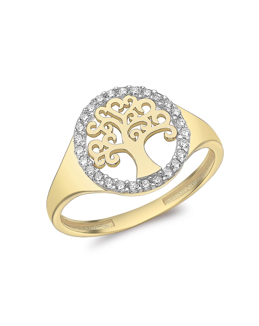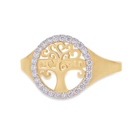 Voeg een vleugje betekenis en elegantie toe aan uw collectie met deze 9 karaats geelgouden ring in de vorm van een levensboom . Het centrale opengewerkte motief van de levensboom, een universeel symbool van kracht, groei en harmonie, wordt versterkt door een cirkel van 27 witte zirkoniumoxiden van 1 mm, die op delicate wijze zijn bezet met pinnen.
