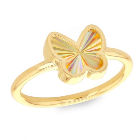 Laat u verleiden door de poëzie van deze vlinderring van 9-karaats geelgoud, met een ontwerp dat zowel modern als betoverend is. Het vlindervormige motief met regenboogreflecties vangt het licht schitterend dankzij de waaiervormige afwerking, wat een gevoel van lichtheid en metamorfose oproept.