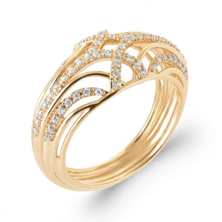 Verfraai uw hand met deze prachtige damesring van 18-karaats verguld zirkonium , met opengewerkte lijnen en verfijnde rondingen. Deze damesring, versierd met een regen van schitterende zirkoniumoxiden, combineert moderniteit en verfijning. De gekruiste en open patronen creëren een lichtspel dat de aandacht trekt.