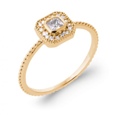 Deze 18-karaats vergulde ring betovert met zijn delicate en verfijnde ontwerp. De centrale vierkante witte zirkonia , subtiel omringd door een halo van sprankelende zirkonia , zorgt voor een elegante schittering die doet denken aan klassieke sieradenringen.