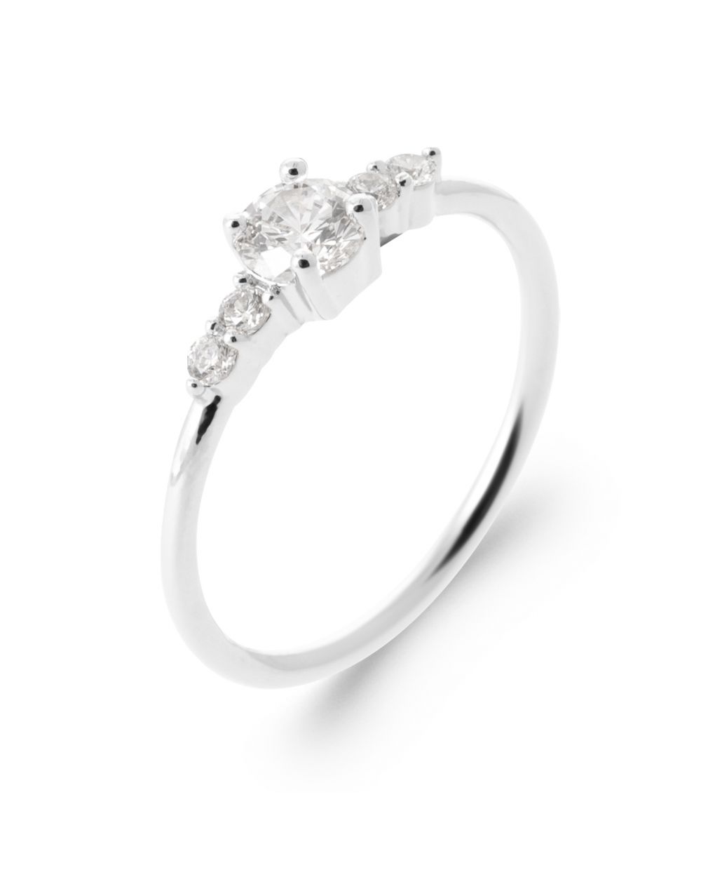 Het verfijnde ontwerp toont een stralende centrale steen , versterkt door delicate zirkoniumoxiden aan weerszijden. Dit samenspel van schittering zorgt voor een subtiele fonkeling met behoud van een verfijnde elegantie.