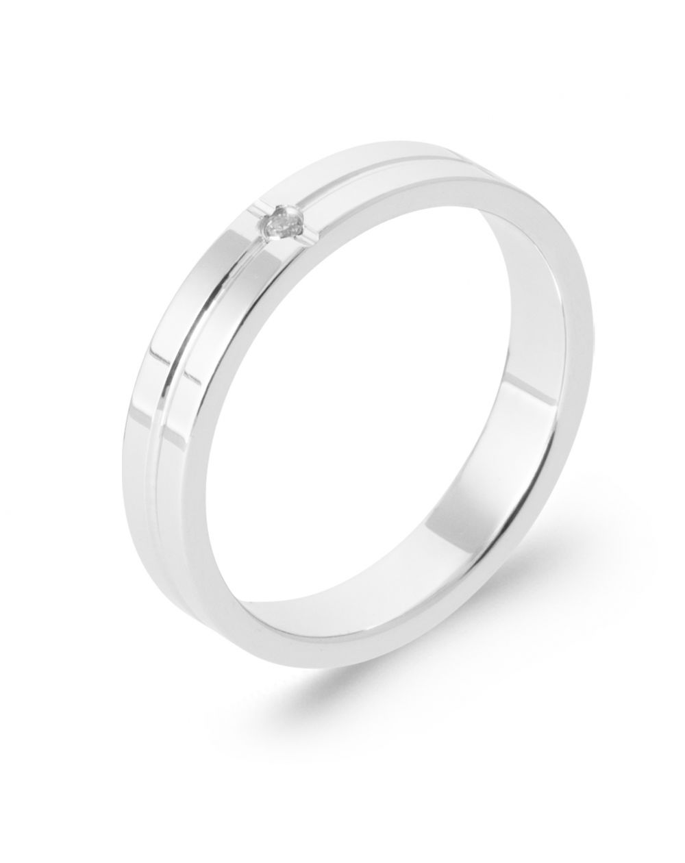Het strakke ontwerp wordt versterkt door een fijne, gestructureerde lijn die over de ring loopt en een subtiele steen accentueert voor een vleugje verfijnd licht. Deze trouwring belichaamt perfect de balans tussen moderniteit en traditie .