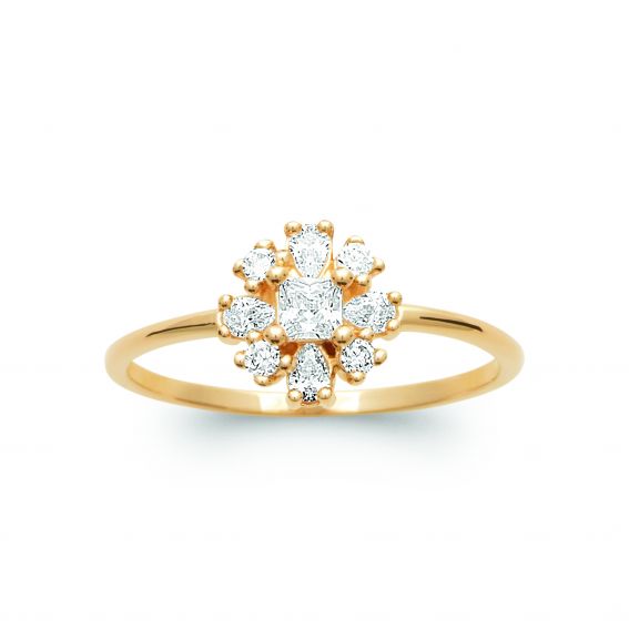 Laat u betoveren door de delicate schoonheid van de vergulde Fleur Éclat Élina ring , een verfijnde creatie die de schoonheid van een bloem in het licht oproept. Het harmonieuze ontwerp combineert een stralende centrale steen met een halo van fonkelende zirkonia , waardoor een elegant en tijdloos bloemmotief ontstaat.