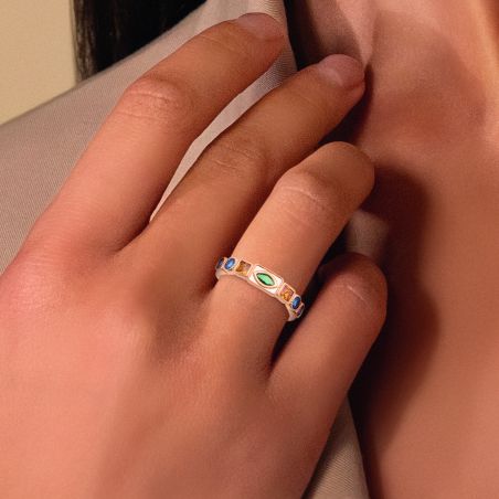 Elke steen voegt een subtiele kleurtoets toe – diepgroen, intens blauw, delicaat paars of stralend goud – waardoor een harmonieus en boeiend samenspel van contrasten ontstaat. Het unieke ontwerp maakt het een ideale ring voor wie houdt van sieraden met een sterke persoonlijkheid.