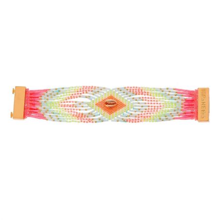 Een essentieel en tijdloos element, onze iconische manchet blijft zichzelf opnieuw uitvinden! Hier worden de zachte, heldere tinten van de zomerhemel weergegeven, net voordat de zon de horizon bereikt. We houden van het XL-formaat en het delicate weven van de rocailles die de pols weelderig sieren. In het midden voegt onze fijne gouden kaurischelp, tijdloos en iconisch, een vleugje glamour en chic toe aan deze manchet.