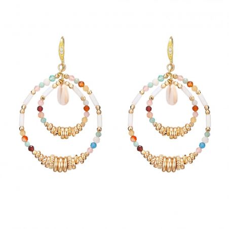 Deze oorbellen, iconen van de Hipanema-garderobe en representatief voor zomerkleuren, gemonteerd als dubbele oorringen op een sleeper bezet met strass-steentjes, roepen de zachte pasteltinten op van een zonsondergang boven een turquoise zee. Amazoniet, kwarts en granaat worden afgewisseld met fijne rondellen verguld met fijn goud en geplaveid met strass-steentjes. In het midden van elke hoepel balanceert een cilindrisch stuk de symmetrie van de halfedelstenen, allemaal versterkt met een schattige porceleinslakschelp. Wij houden van ze zonder mate!