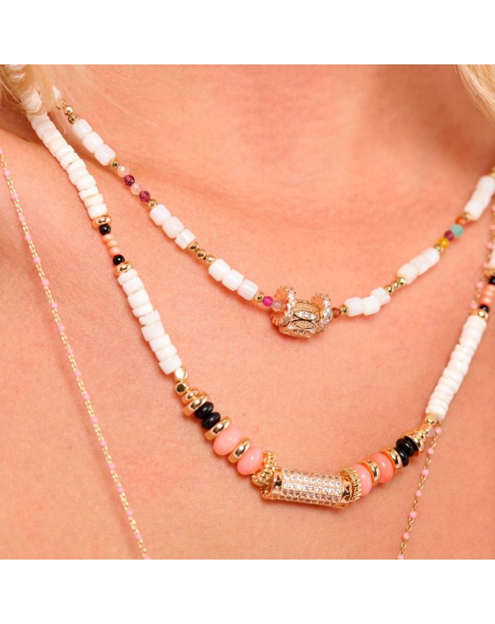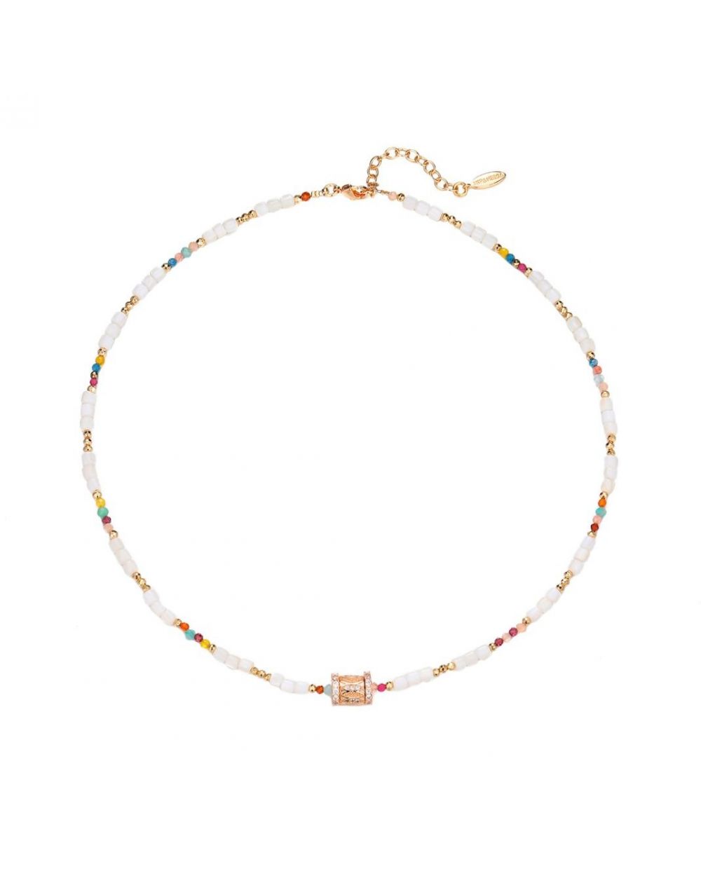 Dit thema is een gepassioneerd statement voor de oceaan, het zeewater en verre reizen en neemt je mee naar de boeiende en zonnige wereld van Hipanema, waarbij op creatieve wijze de emblematische codes van het merk worden geherinterpreteerd. Laat u verleiden door dit schattige collier, verguld met fijn 14-karaats goud, verfraaid met halfedelstenen in pasteltinten. Versierd met een elegant centraal stuk verguld met fijn goud en bezet met kristallijne zirkonen, zal het je nek sieren, alleen of samen, en doet het denken aan zeewater en je liefde voor exotische kusten.
