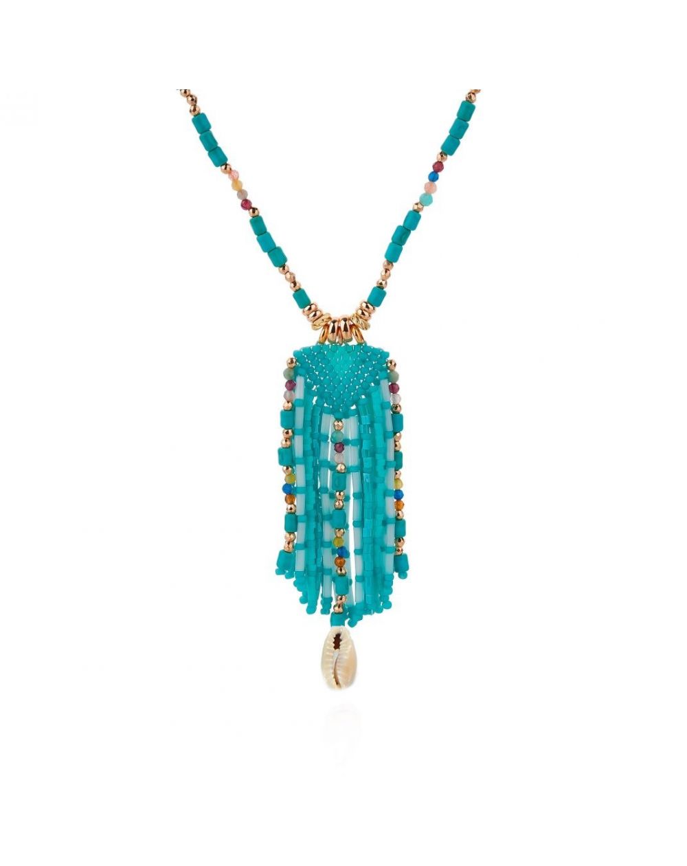 Een smakelijke mix van inspiraties tussen reizen, de zee en de Boheemse invloed die Hipanema dierbaar is, maakt deze prachtige ketting van 14-karaats fijn goud tot een essentieel onderdeel van je zomergarderobe! De lengte, elegant ontspannen in turquoise en gouden tinten, en de hanger met rocailles, subtiel geweven in de vorm van een waterval, schetsen smaakvol de contouren van een halslijn of de lijnen van een zwempak. Een ultieme uitnodiging om te reizen en onbekende kusten te verkennen.