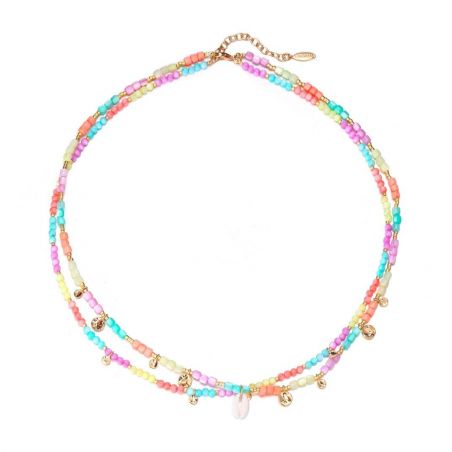 Als de zomer een sieraad zou zijn, zou het deze chokerketting met dubbele rij in felle kleuren zijn. Het belichaamt op een luchtige manier de zoetheid van de vakantie, het kabbelen van de golven, de kust, het opspattende zeewater, het zand dat door de vingers glipt en de laaiende zomerlucht. Mooie belletjes verguld met fijn goud sieren de twee rijen van de ketting, en de kaurischelp, een emblematisch stuk van ons thema, maakt de structuur compleet. Een zomerse en tijdloze must-have, met lieve kinderachtige tonen, die je niet meer uit wilt doen!