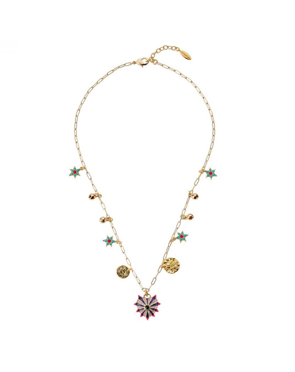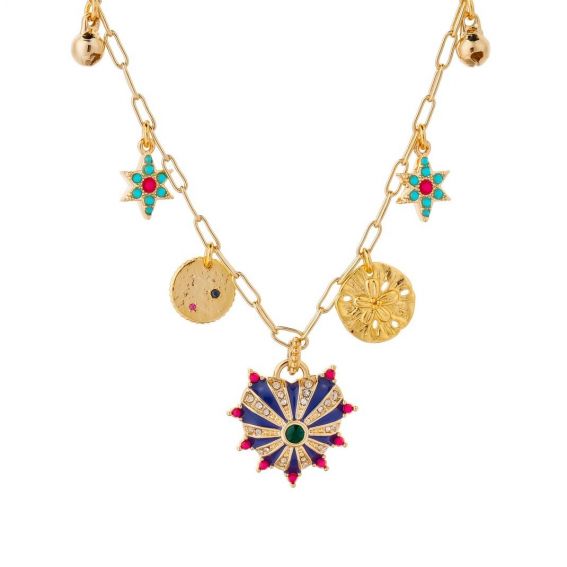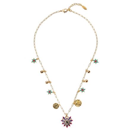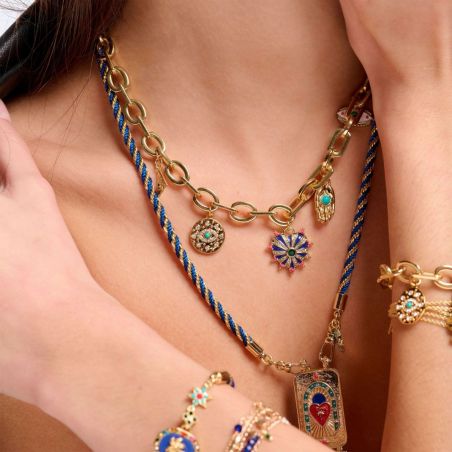 Deze delicate 14-karaats fijne gouden chokerketting blijkt een kostbare talisman te zijn, ontworpen om je te omhullen met zachtheid en zorgzame bescherming. De paperclipketting met grafisch ontwerp is prachtig versierd met fonkelende sterren, geluksamuletbellen, oogverblindende kwastjes en een gestreept hart van email. Dit hart, subtiel ingelegd met strasssteentjes en verfraaid met een betoverende smaragdgroene steen, geeft een vleugje magie aan het geheel. Een juweel dat we oneindig koesteren vanwege de elegantie en bescherming die het biedt, waardoor zowel onze stijl als onze geest worden versterkt.