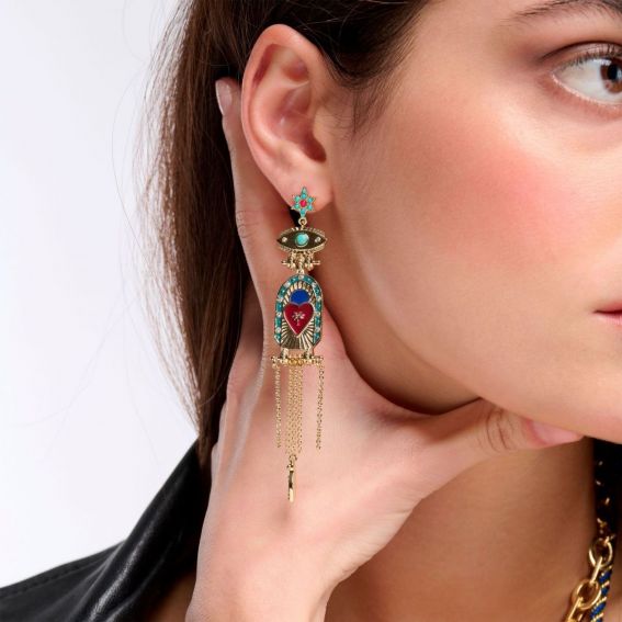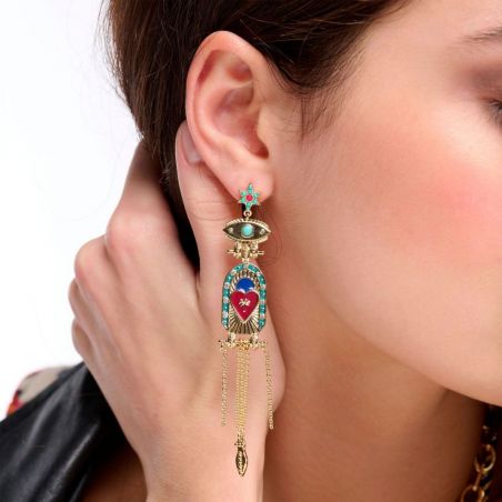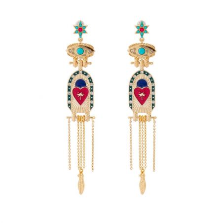 Vrouwen met karakter, stoer en mysterieus: dit thema is voor jou ontworpen! Durf de routine achter je te laten en dompel jezelf onder in de fascinerende wereld van een chique en boeiende heldin. Tussen welwillend bijgeloof en betoverende intriges kun je de betoveraar in jezelf wakker maken met dit weelderige paar oorbellen verguld met fijn goud. Deze oorbellen zijn slank en perfect geproportioneerd en versierd met een kleine sprankelende strass-ster die de bovenkant van het sieraad subtiel verlicht. Beneden dient een verfijnd en oogverblindend beschermend oog als spil voor het centrale stuk, een waar meesterwerk waar een lijn van emaille, bezet met pavé strasssteentjes, een hart in donker fuchsiakleurig email omlijst. Op dit hart staat een ingelegde palmboom, omringd door betoverende en suggestieve stralen. De trapsgewijze kettingen, aan het uiteinde waarvan een fijn bladgoud bungelt, vervolledigen deze unieke creatie, die al begeerd werd vanwege zijn gedurfde elegantie en mysterieuze allure.