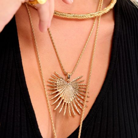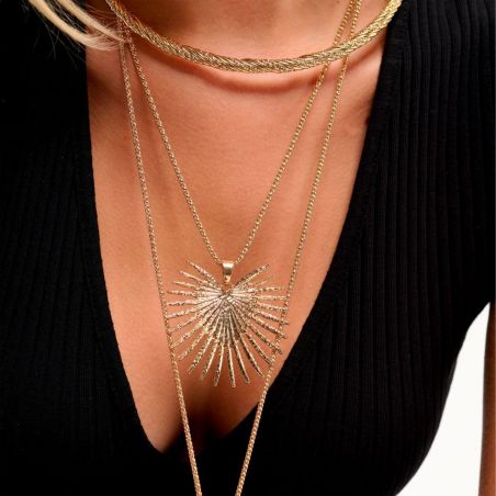 De Prestige- collectie durft moedig volume, pracht en luxe toe te voegen en biedt ons een selectie van unieke stukken die conventies negeren en een assertieve stijl tonen, vol opzichtige zwier. Deze ketting van 14-karaats fijn goud heeft een weelderige hanger die doet denken aan een zonnester; het stralende patroon maakt het tot een iconisch kledingstuk om met trots te dragen.
