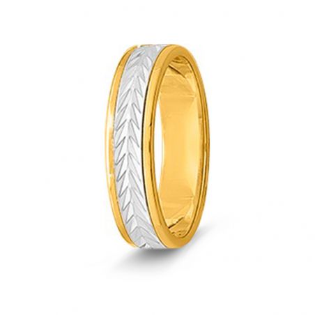 Deze 18k wit-geel tweekleurige gouden trouwring is een trouwring met een structuurpatroon in het midden. Deze trouwring kan gepersonaliseerd worden met een gravure (datum en voornaam).