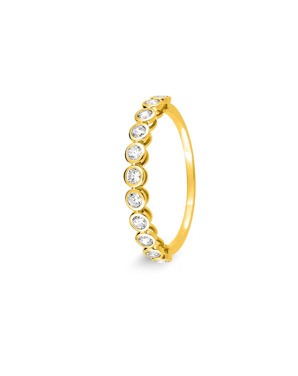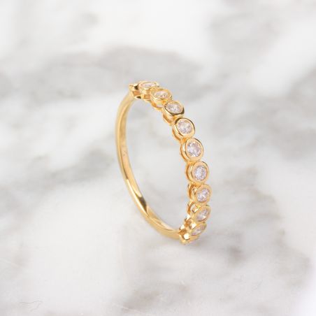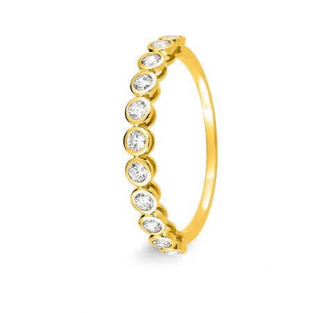 Deze halve trouwring in 9 karaat geelgoud is een Amerikaanse trouwring bezet met 11 zirkoniumoxide stenen. Deze trouwring kan gepersonaliseerd worden met een gravure (datum en voornaam).