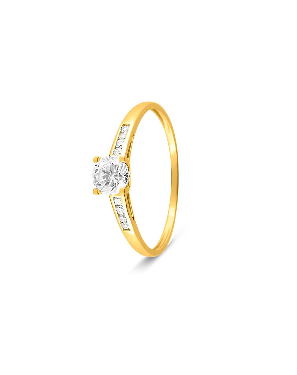 Deze halfstoned railsolitaire in 9 karaat geelgoud is een solitaire met zirkoniumoxidestenen.