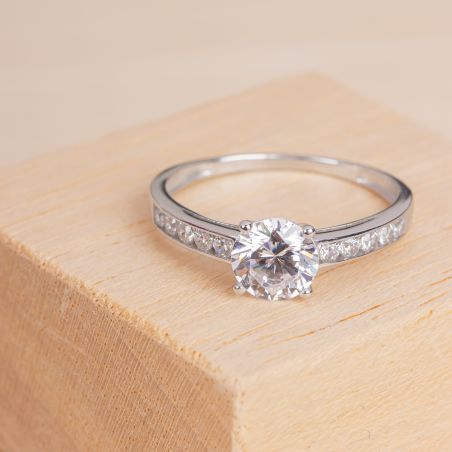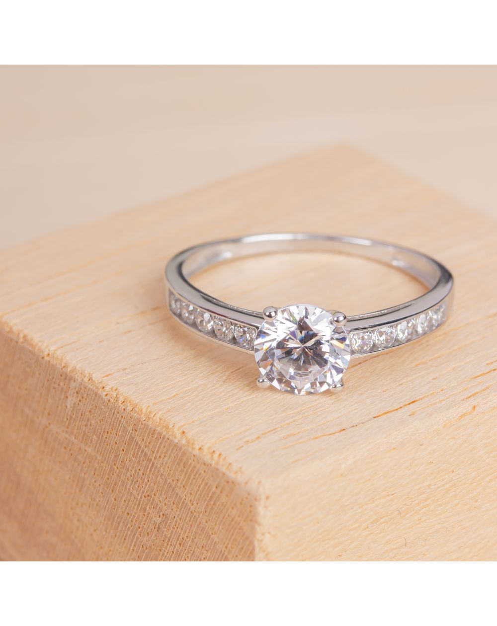 Deze 9k witgouden railsolitaire ring is een solitaire met zirkoniastenen.