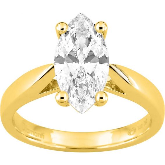Deze gedurfde en spectaculaire solitaire ring van 18-karaats geelgoud (Au 750) is verfraaid met een marquise-geslepen, in het laboratorium gekweekte diamant van minimaal 2,00 karaat . Het slanke silhouet met taps toelopende uiteinden vangt het licht intens op en creëert een opvallend visueel effect dat de hand elegant verlengt.