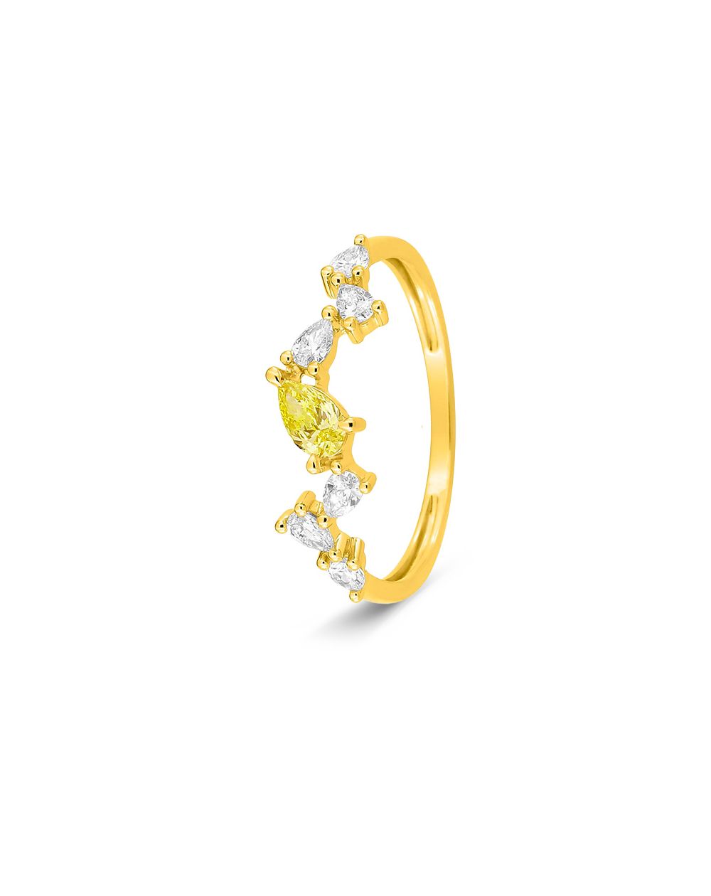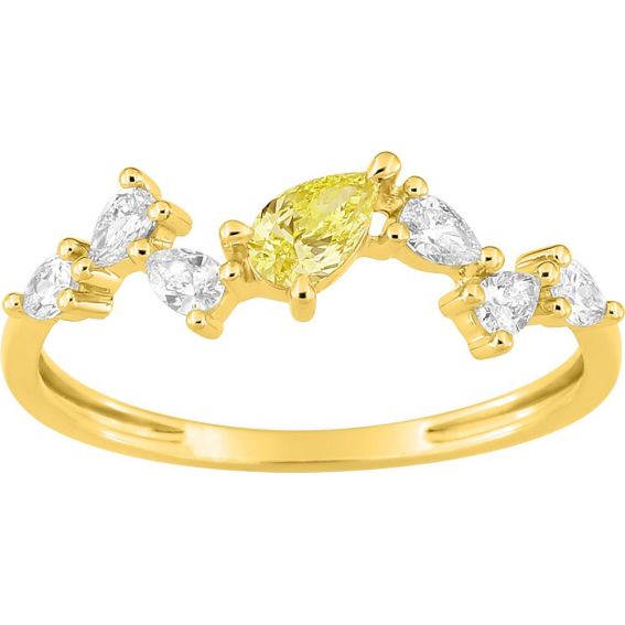 Deze ring van 375 goud, bezet met witte en gele, in het laboratorium gekweekte diamanten, is ideaal als verfijnd sieraad voor elke dag , als elegant cadeau of als slanke ring met een sterke persoonlijkheid.