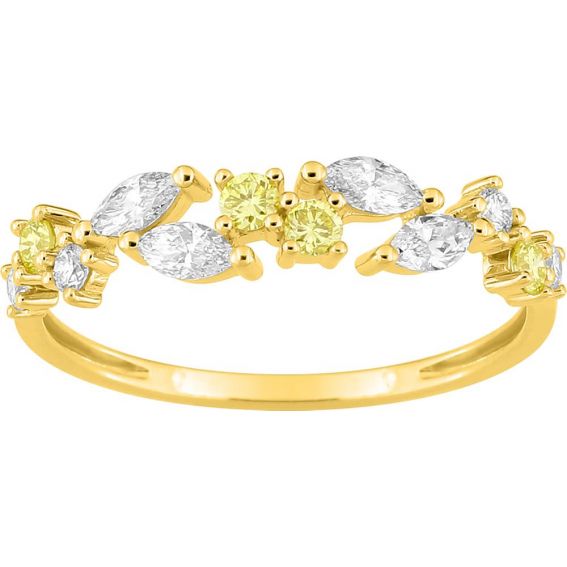 Elegant en subtiel stralend, combineert deze ring van 9 karaat (375‰) geelgoud harmonieus witte en gele, in het laboratorium gekweekte diamanten met een totaal gewicht van 0,47 karaat . De delicate afwisseling van de stenen creëert een verfijnd samenspel van contrasten, waarbij pure schittering samensmelt met gouden warmte voor een look die zowel modern als tijdloos is.
