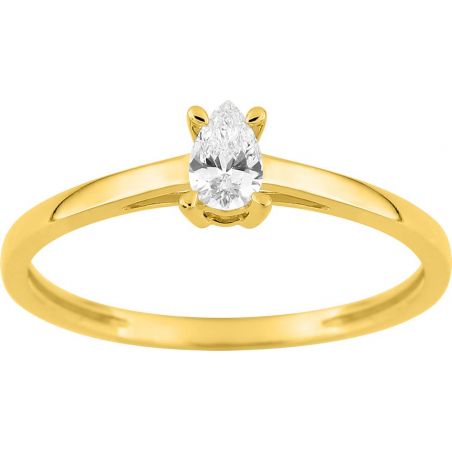 Deze delicate en schitterende solitaire ring van 9-karaats (375‰) geelgoud is bezet met een peervormige, in het laboratorium gekweekte diamant van 0,19 karaat . De elegant langwerpige vorm, kenmerkend voor de peervormige slijpvorm, laat de vinger optisch slanker lijken en zorgt voor een zachte, harmonieuze schittering.