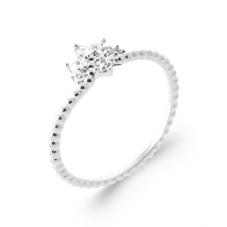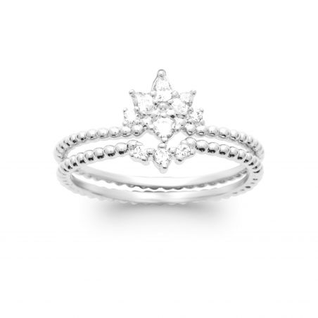 De Iséline-ring betovert met zijn verfijnde ontwerp met dubbele band, versterkt door een centraal motief van fonkelende stenen in een cluster .