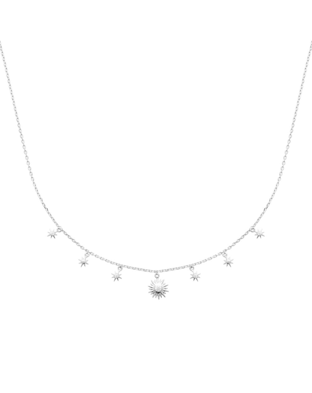 Het is vervaardigd uit een delicate ketting van 925 zilver en versierd met een reeks kleine, fonkelende sterren en een centrale zonnehanger, wat een elegant en stralend, trapsgewijs effect creëert.
