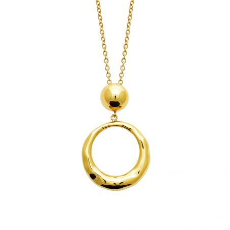 Omarm een strakke, eigentijdse stijl met de Gold Sculpted Circle-ketting van roestvrij staal. De hanger combineert een gepolijste bol met een onregelmatig gevormde, organische ring, waardoor een perfecte balans ontstaat tussen minimalisme en karakter.