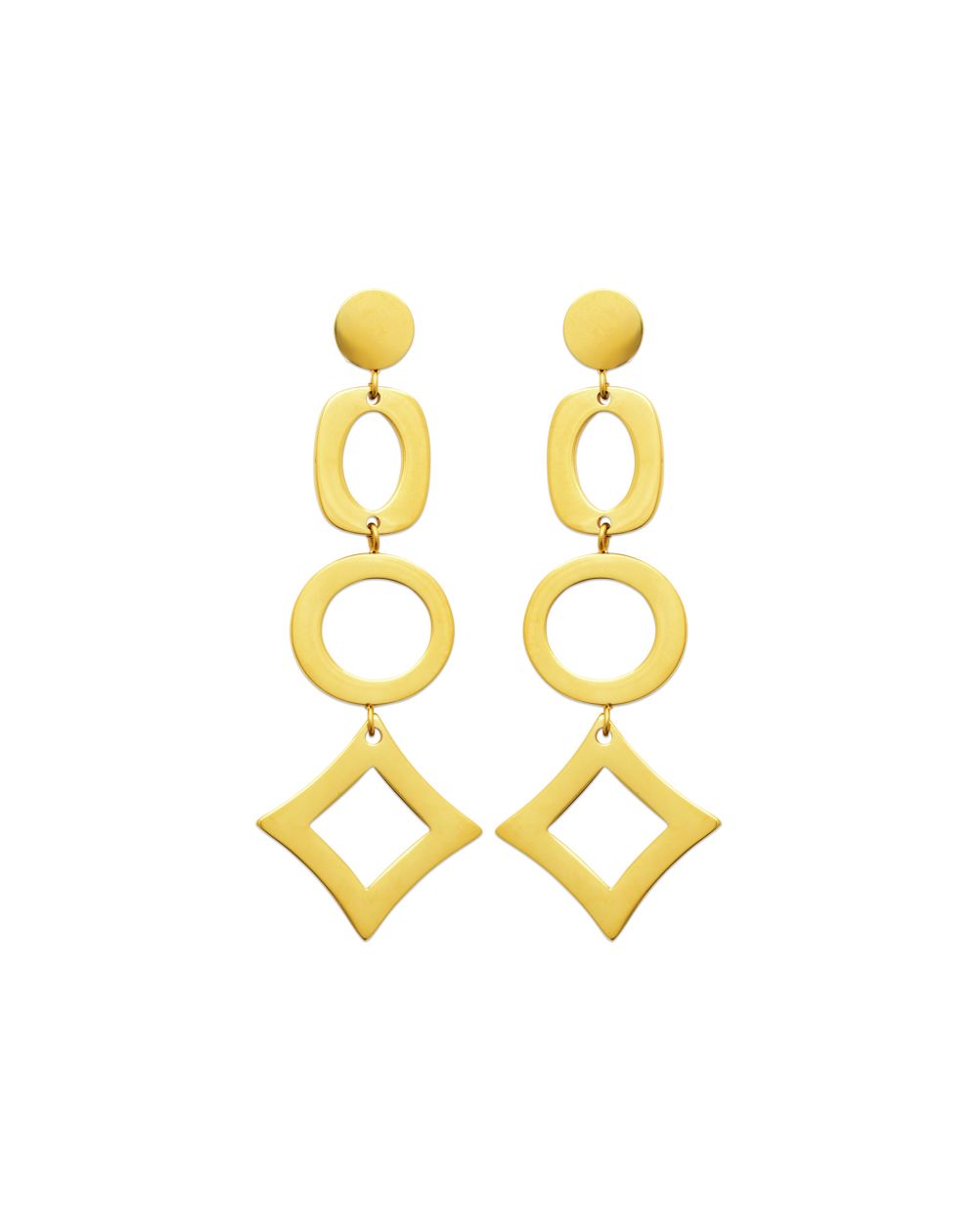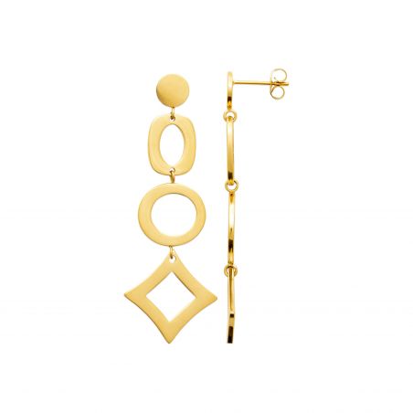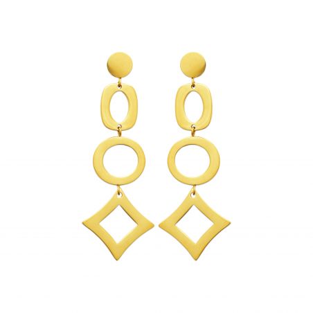 Maak een statement met de Oria-oorringen , een grafisch en uitgesproken modern ontwerp. Vervaardigd uit verguld roestvrij staal , vallen ze op door het samenspel van opengewerkte geometrische vormen : cirkels, ovalen en diamanten vloeien harmonieus samen tot een gestructureerd en elegant design.