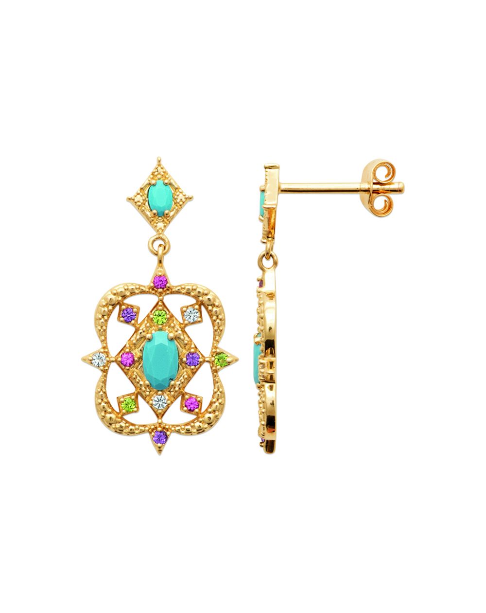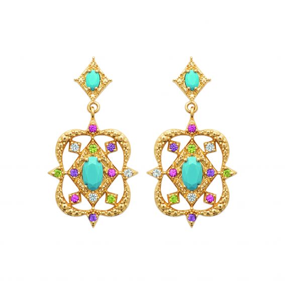 Laat u meevoeren door de verfijnde elegantie van de Orienta Turquoise oorbellen met verguldsel , sieraden met een rijk versierd ontwerp geïnspireerd op oosterse motieven. De opengewerkte structuur onthult nauwgezet vakmanschap, versterkt door een centrale turkooizen steen en kleine gekleurde steentjes die sprankeling en originaliteit toevoegen.